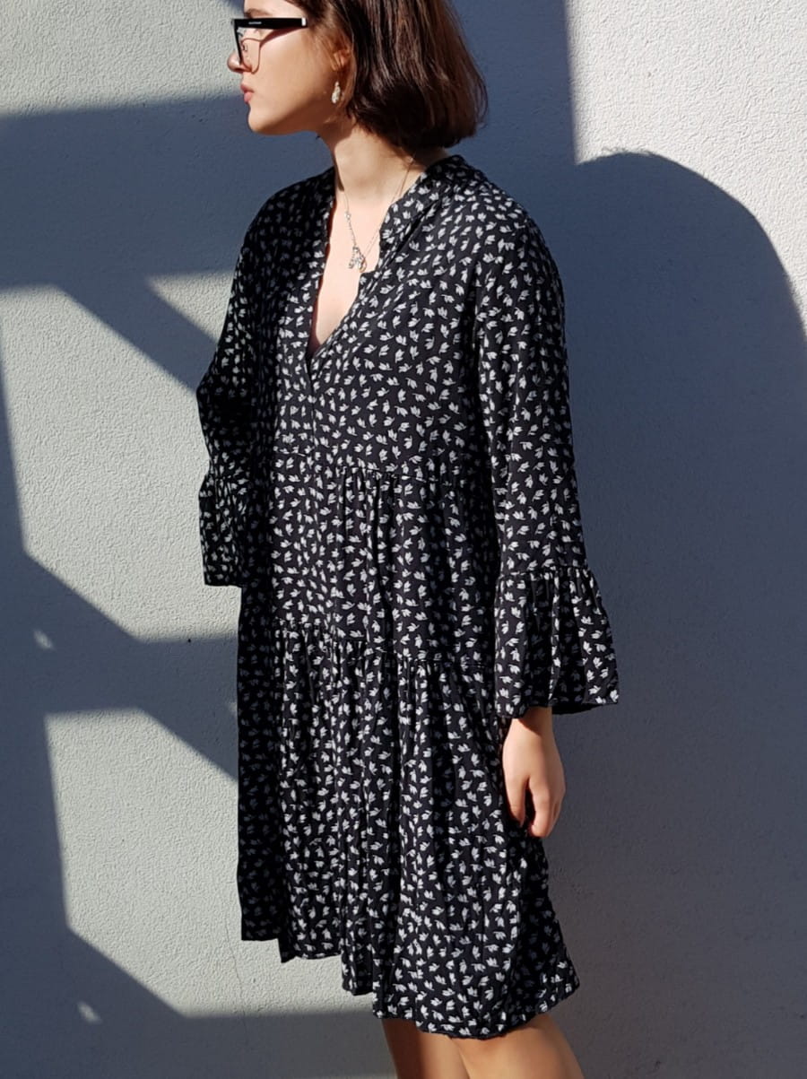 Sukienka jest luźna, nie krępująca ruchów, mega wygodna w noszeniu, a jednocześnie bardzo kobieca, zmysłowa i zwiewna również dzięki zmysłowym rozkloszowanym mankietom przy rękawach.