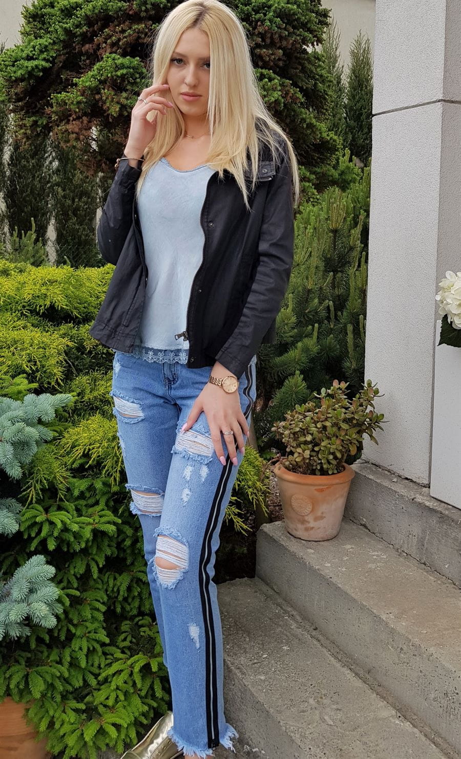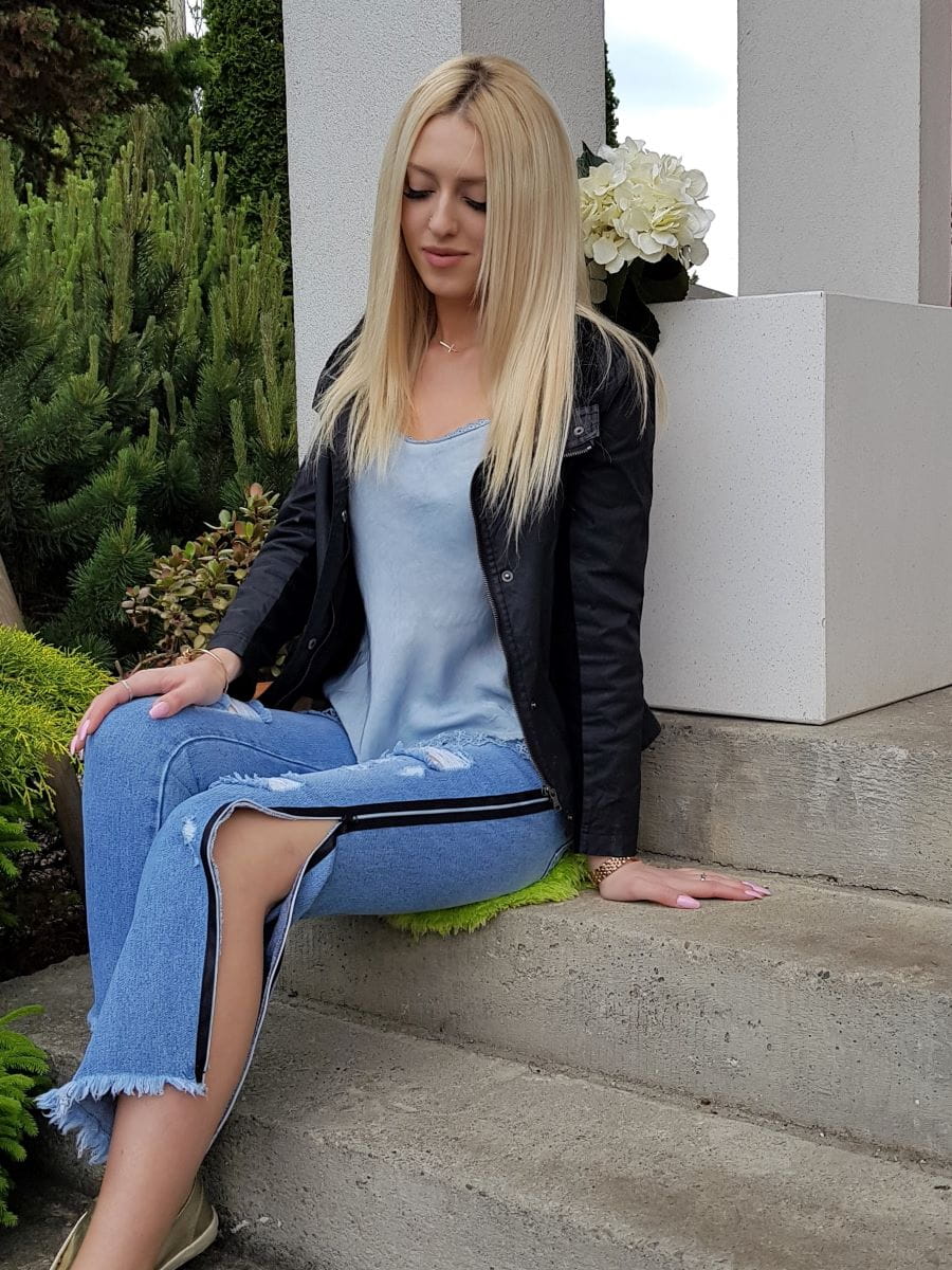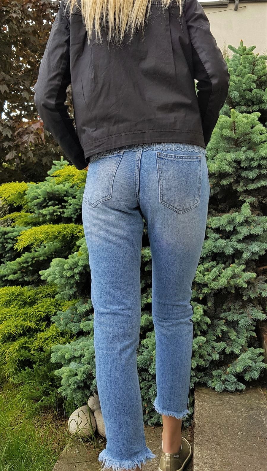 Stylowo postrzępione zakończenie nogawek. Spodnie ozdobione po bokach długim na całą nogawkę zamkiem, który uzupełnia materiał skóropodobny. Nogawki typu cygaretki są zatem rozpinane, aż do pasa zapewniając szybką zmianę stylizacji, eksponowanie nóg.