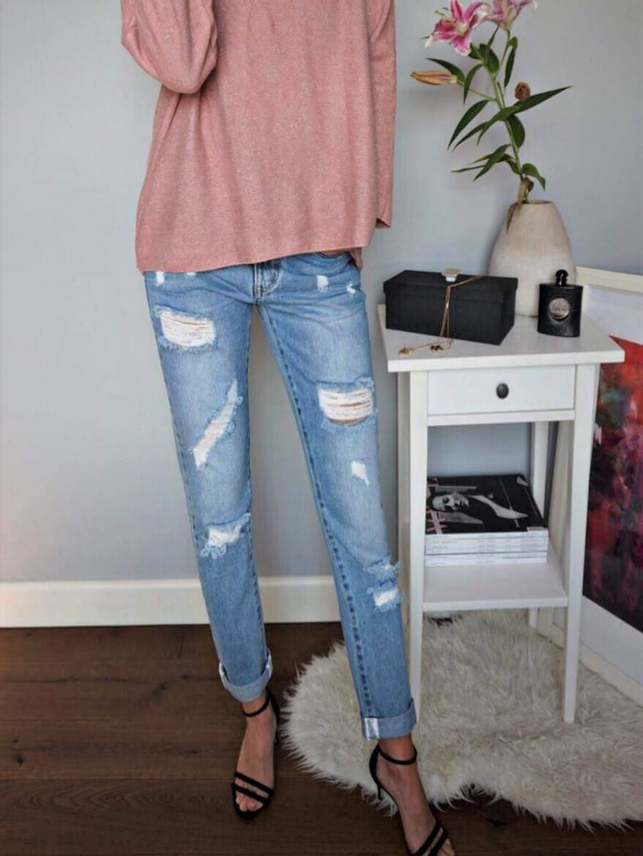 Jeansy Boyfriend przetarciami oraz precyzyjnie wykonanymi dziurami w kolorze jasnoniebieskim.
