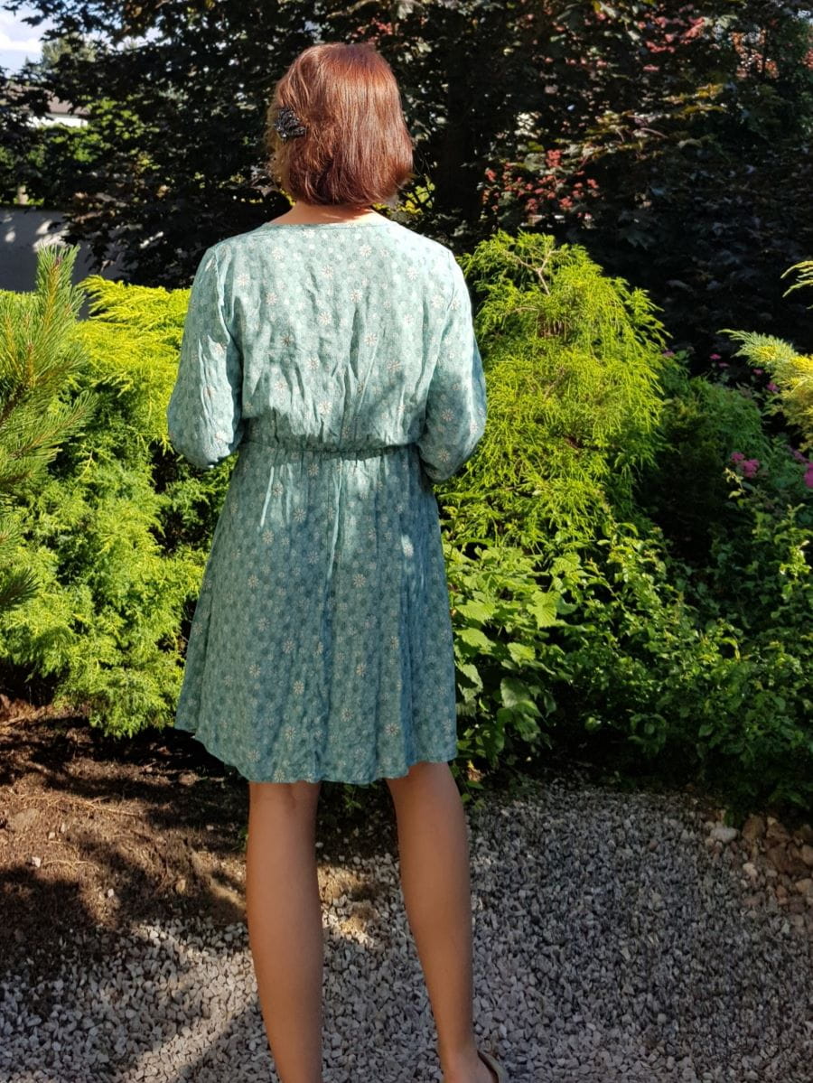 Ciekawy kolor , który włoski producent nazwał Ocean, doda nam pewności siebie i optymizmu. Nam kolor również przypomina szmaragdy. Krój sukienki jej kolor oraz kwiecisty wzór obsypany złotem zapewni bycie wyjątkową i zwróci na siebie uwagę. W dobrym ułożeniu sukienki na ciele pomagają wszyte gumki w zakończeniach rękawów, dzęki czemu rękawy można umieszczać na wybranej wysokości ręki i zmieniach tym samym wedle upodobań look. Gumka znajduje się równiez w pasie, nierozściągnięta ma wymiar około 27cm x2 i może rozszerzyć się do szerokości około 45cm x2. Talie ozdabia też wiązanie i element zakładany z przodu.
