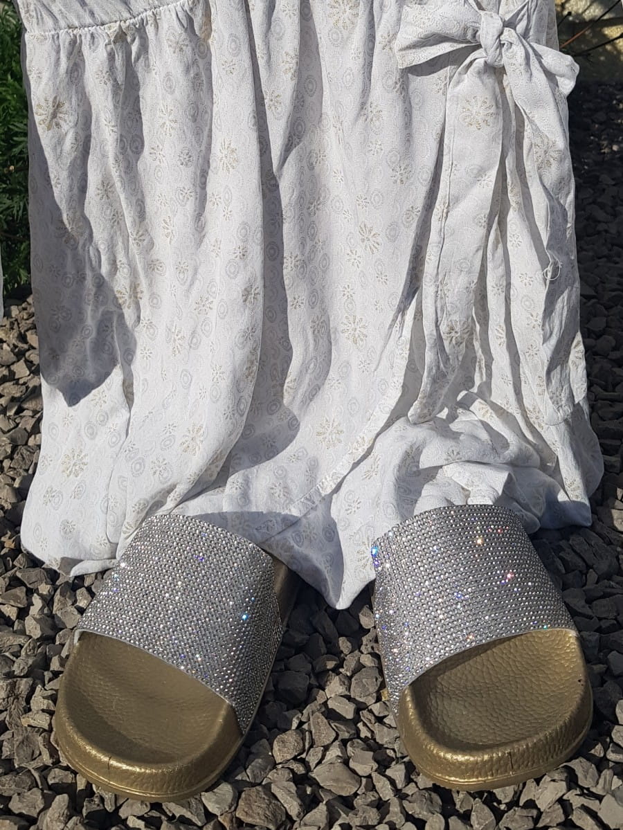 Sukienka Ocean ze złoconymi kwiatuszkami i wiązaniem została zaprojektowana i wykonana we Włoszech.
